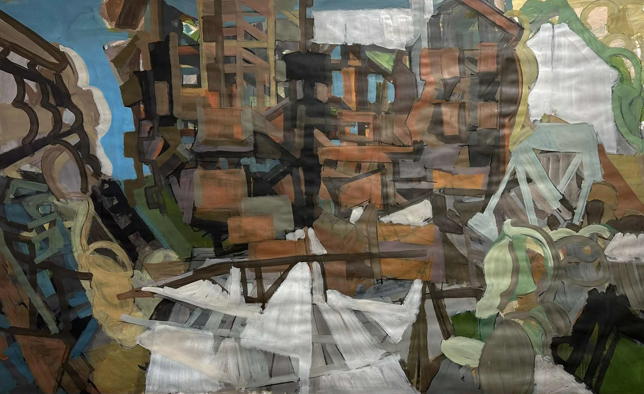 My process is to walk through the city as much as possible, observe the layers of architecture and the flow of the city. Take photos, make sketches, and bring it to the studio to turn it all into paintings. I rely on my peripheral awareness, my unfocused sight, to pull forms and compositions from my surroundings. This is my process to capture the experience of being in Daugavpils.